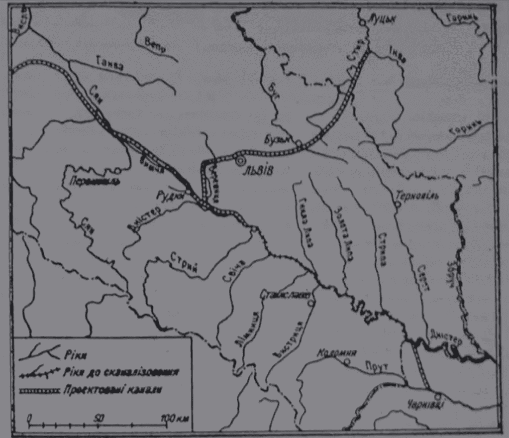Планували з’єднати Чорне та Балтійське моря. Цю ідею висунуло Міністерство транспорту імперії Габсбургів. Відділ гідростатики при цьому міністерстві почав досліджувати та розробляти проєкти водних каналів. Значна частина товарів мала би проходити саме через галицькі землі. У «Технічному часописі» у 1901–2 роках опублікували статті, присвячені цим проєктам.